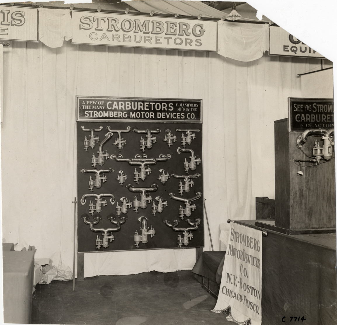 View of Stromberg Motor Devices Co. display of carburetors. Signs with display: "Stromberg carburetors; A few of the many carburetors & manifolds mf'd by the Stromberg Motor Devices Co.; Stromberg Motor Devices Co., N.Y.-Boston-Chicago-Frisco." Stamped on back: "Spooner & Wells, Inc., photographers, telephones 3472-3473 Columbus, 1931 Broadway, New York." Handwritten on back: "Accessories--Carburetors, Stromberg Carburator [sic], 1909."