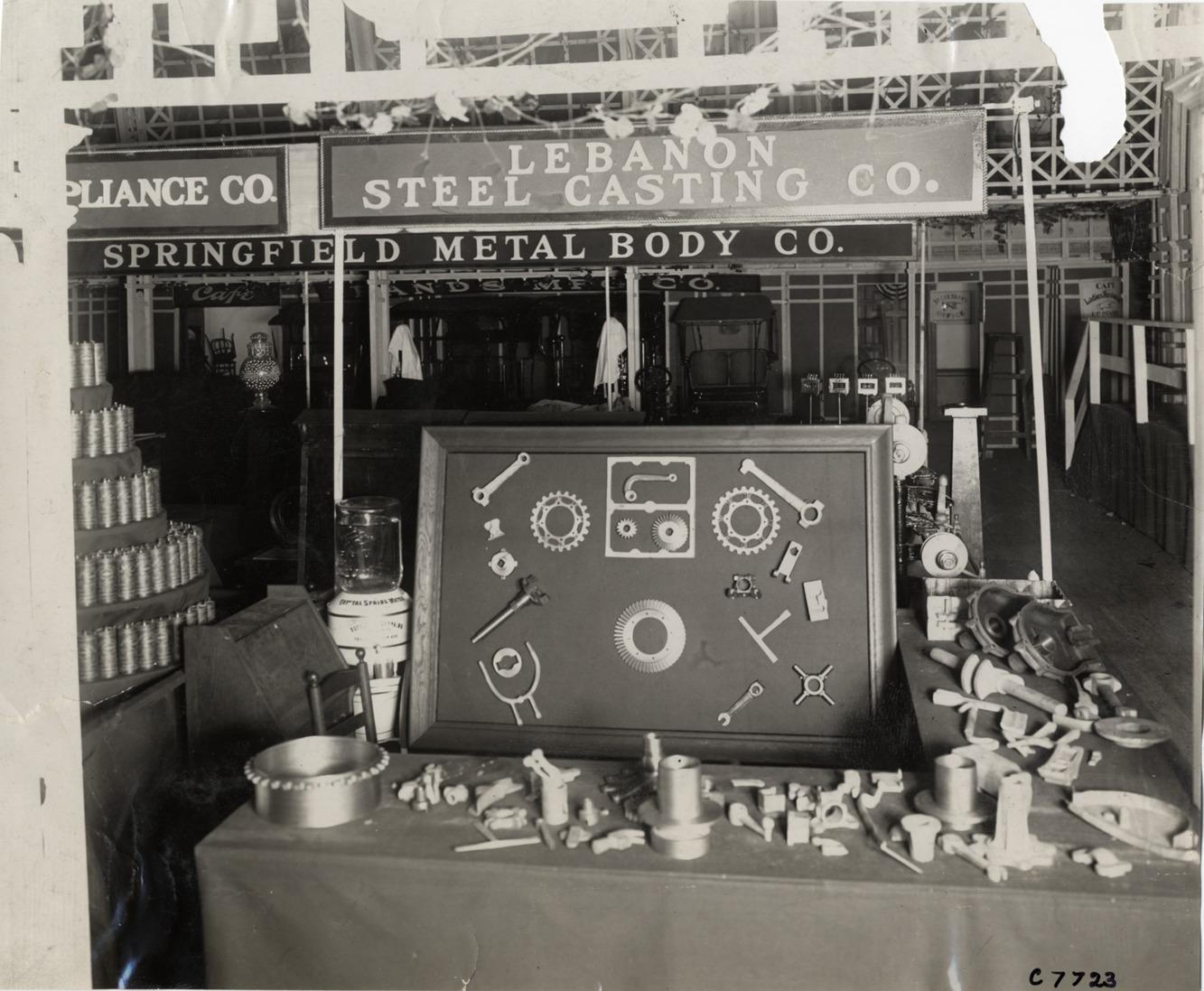 View of Lebanon Steel Casting Co. display. Sign over display: "The Hoffecker Co." Springfield Metal Body Co. sign in background. Stamped on back: "Spooner & Wells, Inc., photographers, telephones 3472-3473 Columbus, 1931 Broadway, New York." Handwritten on back: "Accessories--Castings, Lebanon Steel Casting Co., 1909."