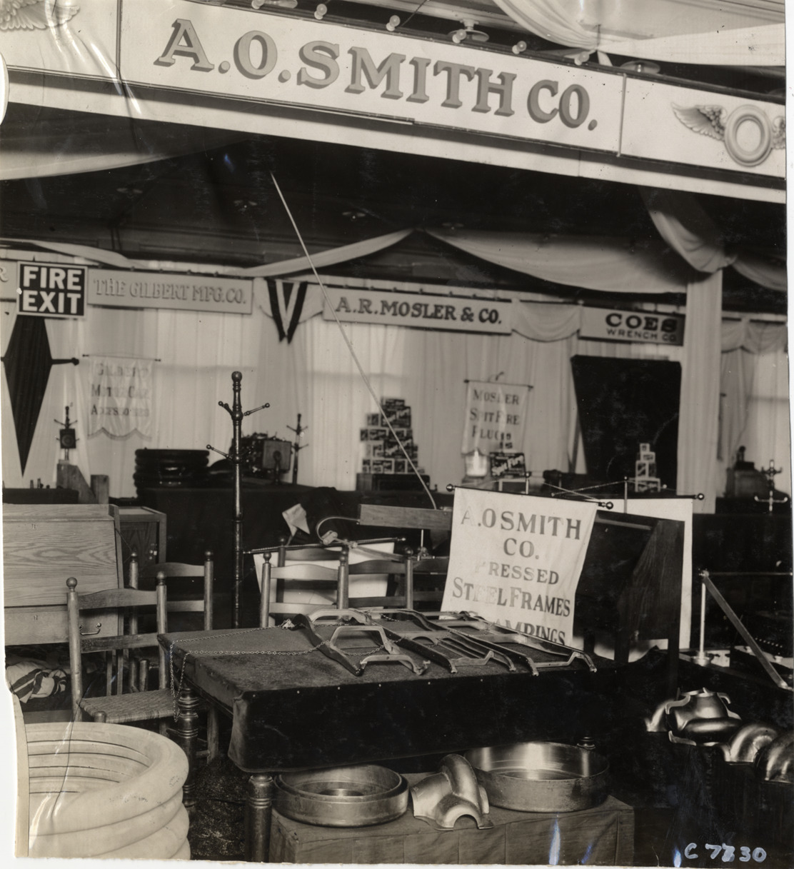 View of display for A.O. Smith Co. steel frames. Signs with display: "A.O. Smith Co.; A.O. Smith Co. pressed steel frames." Stamped on back: "Spooner & Wells, Inc., photographers, telephones 3472-3473 Columbus, 1931 Broadway, New York." Handwritten on back: "Accessories--Frames, A.O. Smith Co., 1909."
