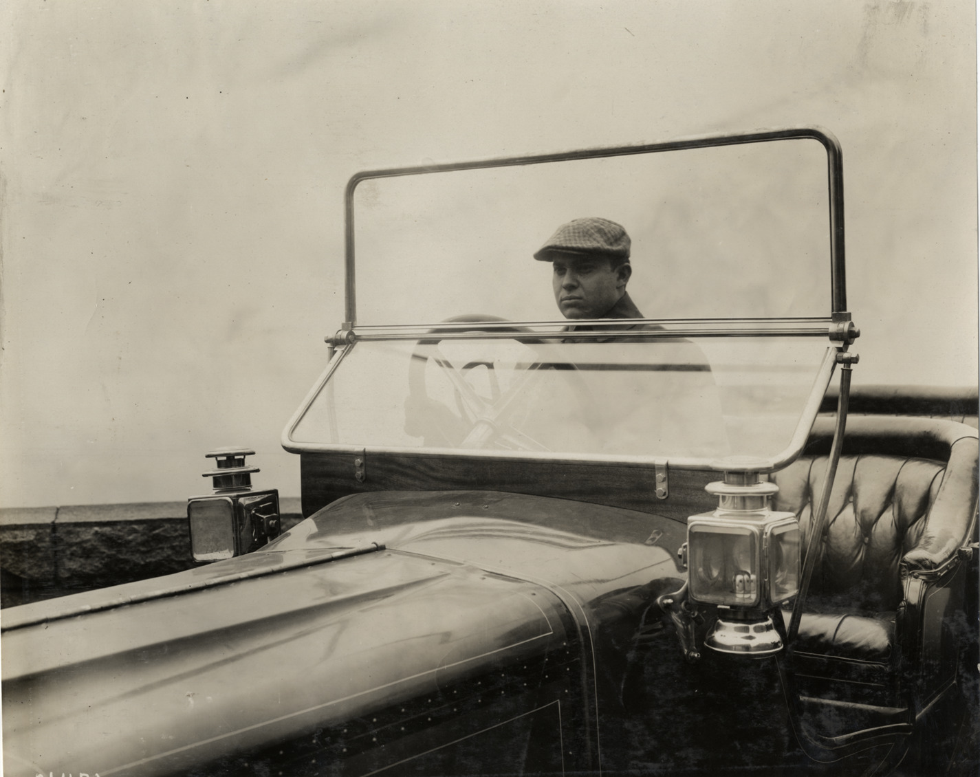 View of man driving car, showing close-up of windshield. Stamped on back: "Spooner & Wells, Inc., photographers, telephones 3472-3473 Columbus, 1931 Broadway, New York." Handwritten on back: "Accessories--Windshields, 1910."