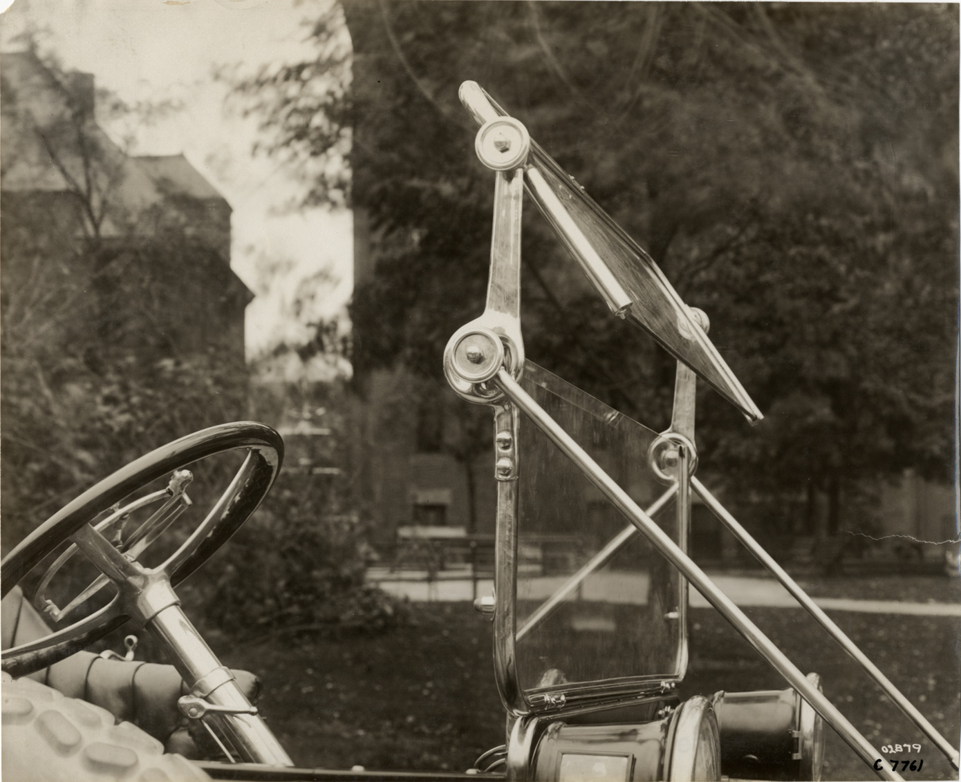 View of Rands windshield on car. Handwritten on back: "Accessories--Rands windshield, 1912."