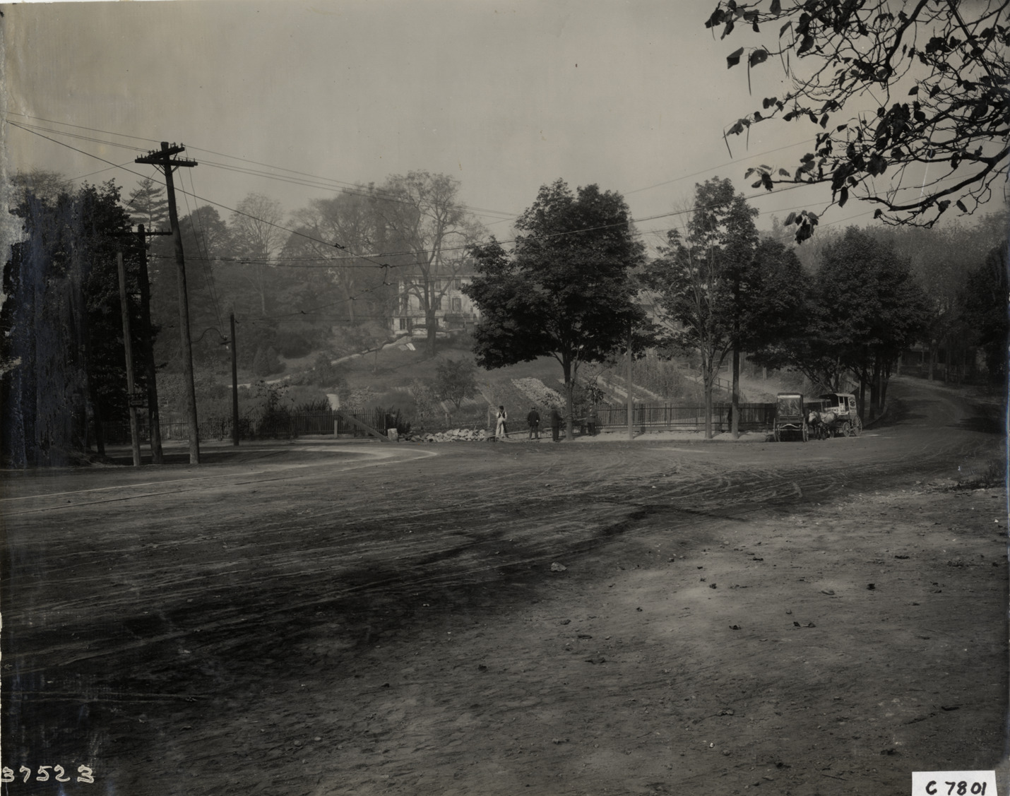 View of aftermath of accident with Pierce-Arrow car; several men stand next to broken fence. Dirt road with sharp turn in foreground; two horse-drawn carriages in background. Handwritten on back: "Accidents. Accident to the Pierce-Arrow car, owned by the Wilson Brothers liquor dealers between N.Y. and Hastings. General view looking towards the direction where the car heading from Hastings on the trip to New York. Where the man with the overalls is standing. Photo taken October 19, 1910."