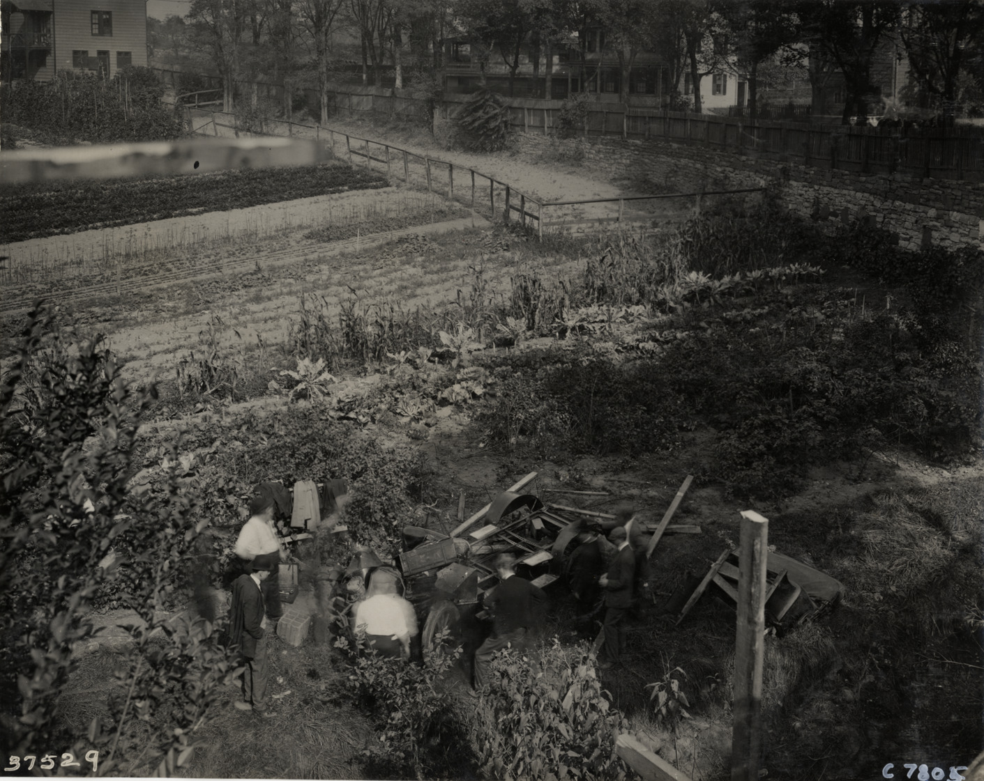 View of aftermath of accident with Pierce-Arrow car; men surround damaged car. Handwritten on back: "Accidents. Accident to the Pierce-Arrow car, owned by the Wilson Brothers liquor dealers between N.Y. and Hastings. What was left of the Pierce-Arrow after going over this embankment. Photo taken October 19, 1910."