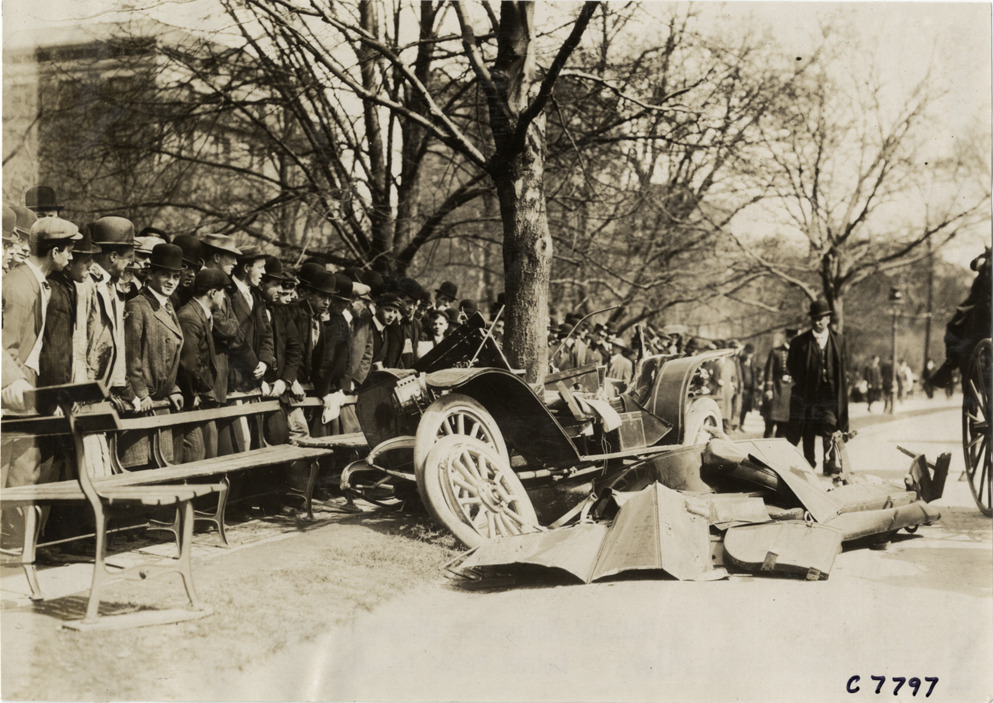 View of car damaged in accident; men stand behind row of park benches in background. Handwritten on back: "Accidents--Paige, 1909."