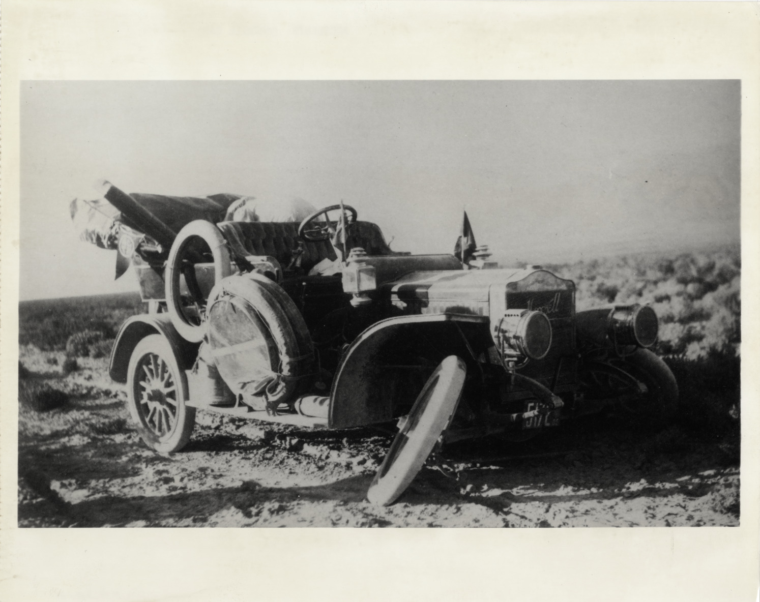 View of Maxwell car damaged in accident. Typed on back: "Accidents, Maxwell car."