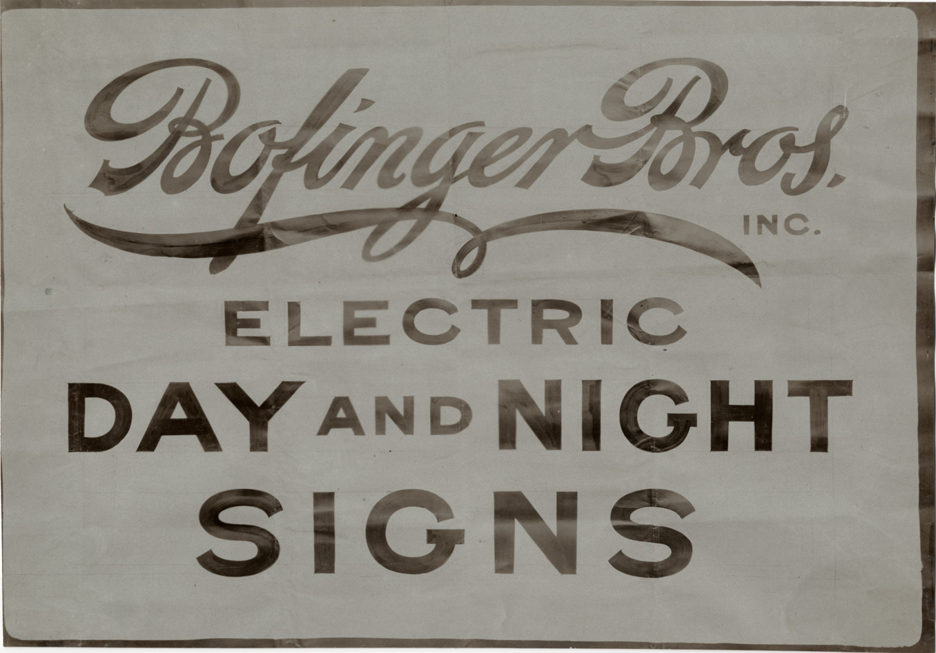 View of sign advertising Bofinger Bros. Inc. electric day and night signs. Stamped on back: "Photo by F. Ed. Spooner, 1536 B'way, telephone 6536-38th St., New York, N.Y." Handwritten on back: "Advertising, 1906."