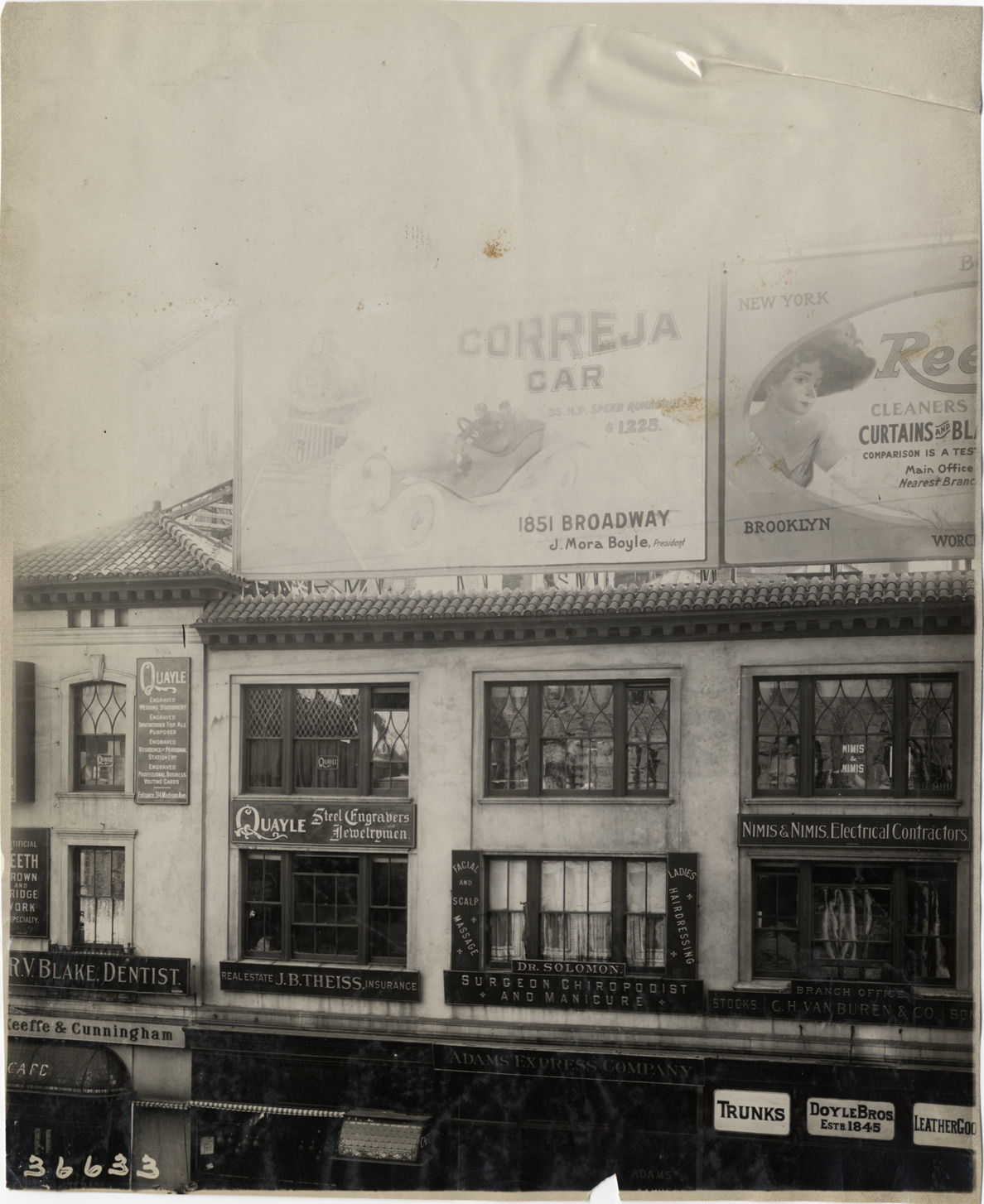 View of billboard advertising Correja car on top of commercial building. Sign reads: "Correja car, 35 h.p. speed runabout, $1225, 1851 Broadway, J. Mora Boyle, president." Businesses include Quayle steel engravers and jewelrymen; Dr. Solomon, surgeon; Nimis & Nimis, electrical contractors and J.B. Theiss real estate and insurance. Stamped on back: "Spooner & Wells, Inc., photographers, telephones 3472-3473 Columbus, 1931 Broadway, New York." Handwritten on back: "Advertising, 1910."