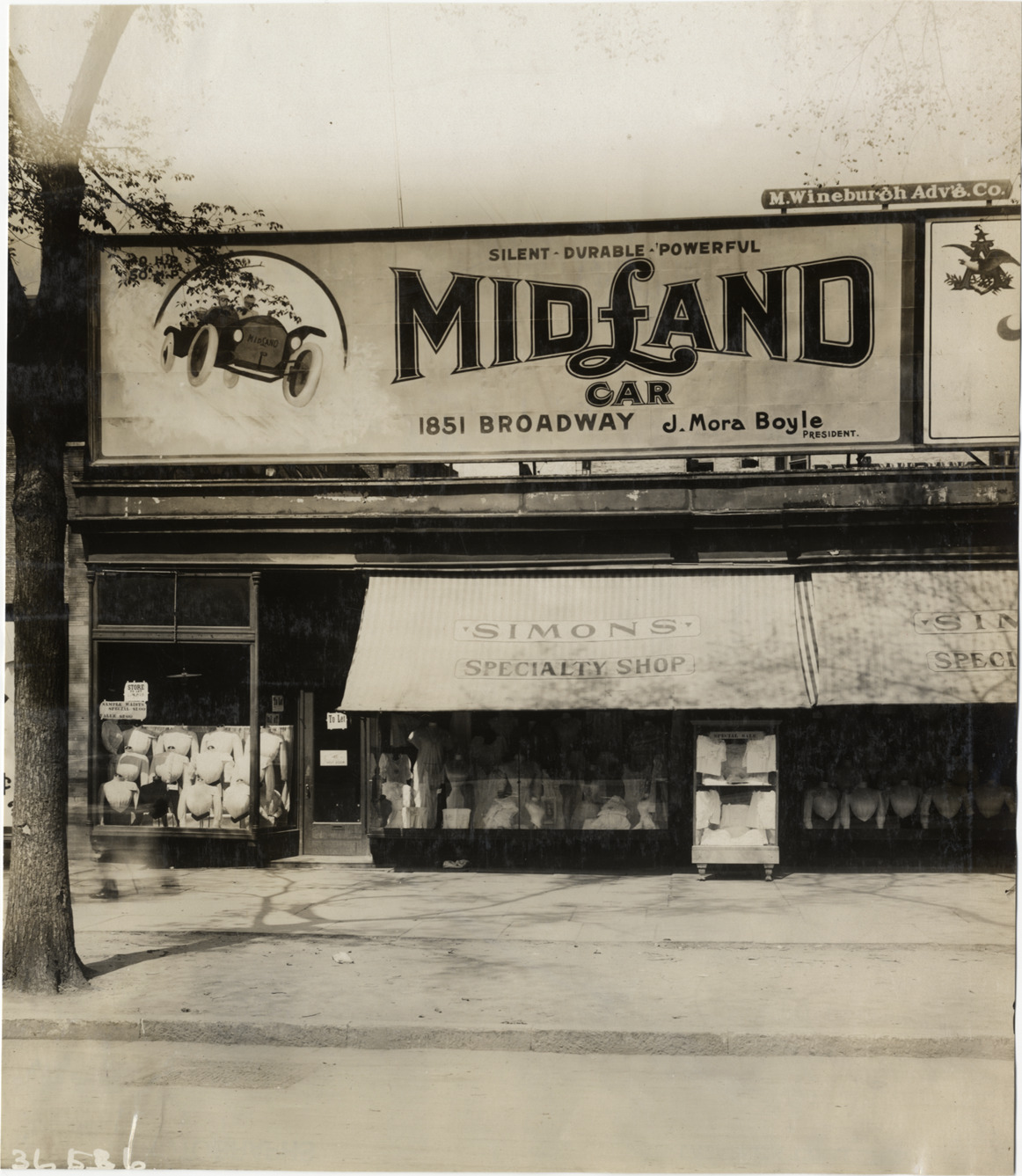 View of billboard advertising Midland car over storefront of Simons Specialty Shop. Sign reads: "Midland car, silent, durable, powerful, 1851 Broadway, J. Mora Boyle, president." M. Wineburgh Advg. Co. sign over billboard. Stamped on back: "Spooner & Wells, Inc., photographers, telephones 3472-3473 Columbus, 1931 Broadway, New York." Handwritten on back: "Advertising, 1910."