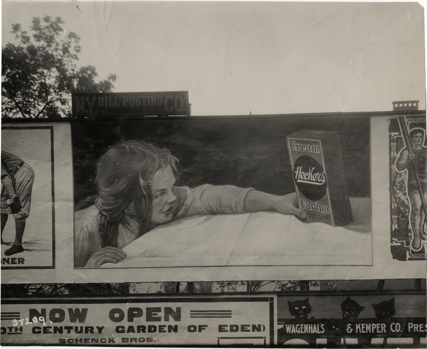View of billboard depicting woman reaching for box of Hecker's cream farina. N.Y. Bill Posting Co. sign over billboard. Stamped on back: "Spooner & Wells, Inc., photographers, telephones 3472-3473 Columbus, 1931 Broadway, New York." Handwritten on back: "Advertising, 1910."