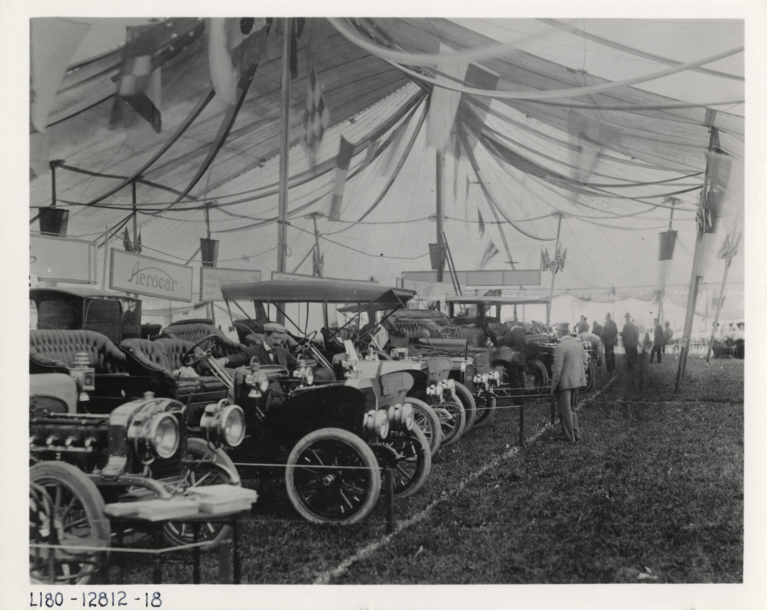 View of display of Aerocar automobiles under tent. Handwritten on back: "Aerocar."