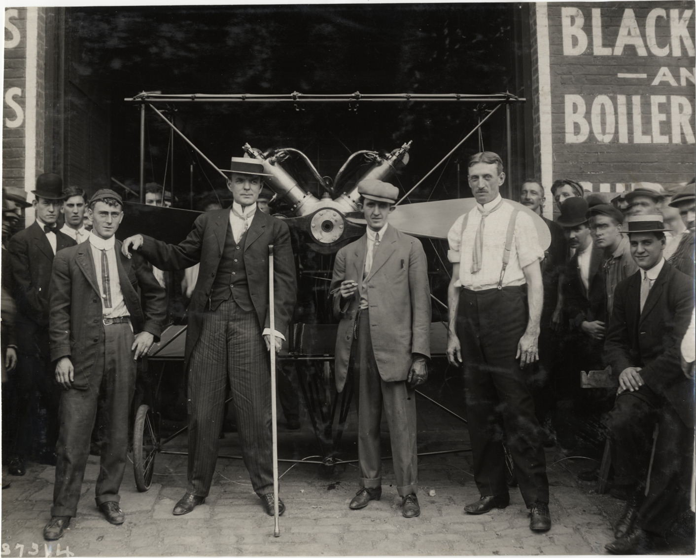View of J. Walter Christie, the aviator Charles Hamilton and group of men posing with a 1910 Christie V8 aircraft engine. Stamped on back: "Spooner & Wells, Inc., photographers, telephones 3472-3473 Columbus, 1931 Broadway, New York." Handwritten on back: "Aircraft, 1910."