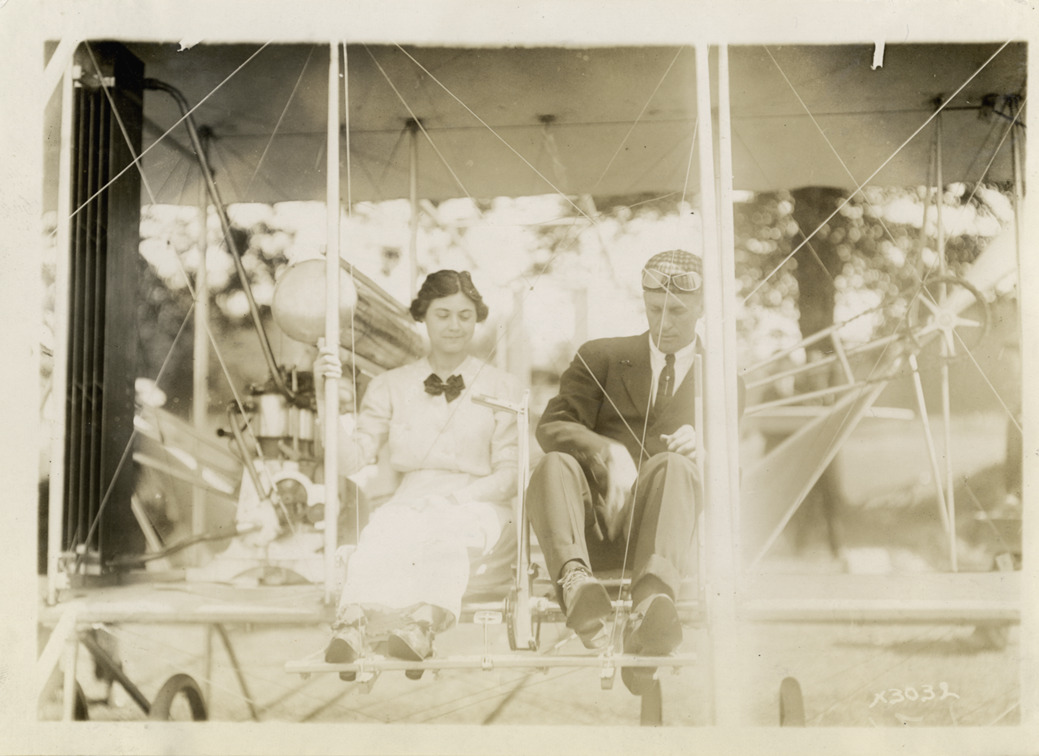 View of Virginia Brush and aviator seated in airplane at Grosse Pointe aviation meet. Stamped on back: "Spooner & Wells, Inc., photographers, 1231 Woodward Ave., Detroit, Mich., telephone North 1745." Handwritten on back: "Aircraft competitions--Grosse Pointe aviation meet, 1911. Miss Virginia Brush." Label on file: "Regarding the Grosse Pointe file. The aviation event took place at the then Grosse Pointe Golf Club, now the site of the Grosse Pointe High School. The occasion was the result of Russell A. Alger's effort to bring the Wright airplane to Detroit. Alger was a founder of the Detroit Aviation Society and an investor in the Wright Airplane Co. The planes [sic] pilot, Frank R. Coffyn, took 41 high status passengers aloft during the period, June 18-20, 1911. Later Alger bought the plane and had Coffyn teach him to fly it."