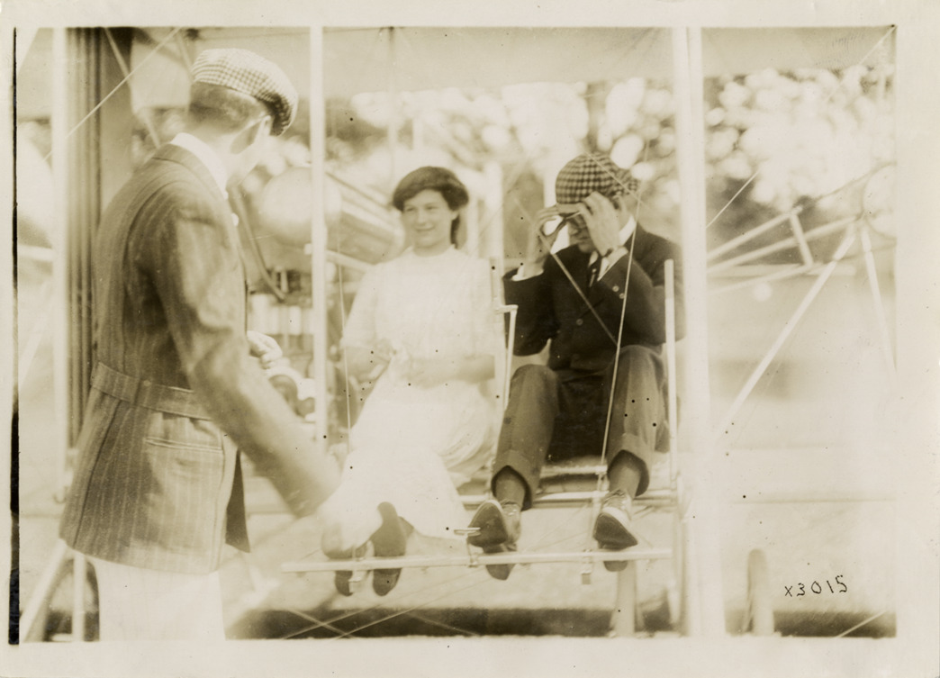View of Josephine Alger and aviator seated in airplane at Grosse Pointe aviation meet. Another man stands in foreground. Stamped on back: "Spooner & Wells, Inc., photographers, 1231 Woodward Ave., Detroit, Mich., telephone North 1745." Handwritten on back: "Aircraft competitions--Grosse Pointe aviation meet, 1911. Miss Josephine Alger, daughter of Russell Alger of Detroit, one of the youngest aviators in the country." Label on file: "Regarding the Grosse Pointe file. The aviation event took place at the then Grosse Pointe Golf Club, now the site of the Grosse Pointe High School. The occasion was the result of Russell A. Alger's effort to bring the Wright airplane to Detroit. Alger was a founder of the Detroit Aviation Society and an investor in the Wright Airplane Co. The planes [sic] pilot, Frank R. Coffyn, took 41 high status passengers aloft during the period, June 18-20, 1911. Later Alger bought the plane and had Coffyn teach him to fly it."