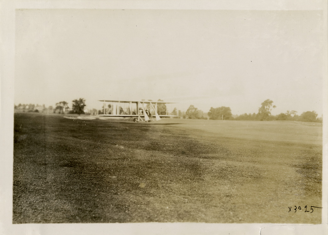 View of airplane in field at Grosse Pointe aviation meet. Stamped on back: "Spooner & Wells, Inc., photographers, 1231 Woodward Ave., Detroit, Mich., telephone North 1745." Handwritten on back: "Aircraft competitions--Grosse Pointe aviation meet, 1911." Label on file: "Regarding the Grosse Pointe file. The aviation event took place at the then Grosse Pointe Golf Club, now the site of the Grosse Pointe High School. The occasion was the result of Russell A. Alger's effort to bring the Wright airplane to Detroit. Alger was a founder of the Detroit Aviation Society and an investor in the Wright Airplane Co. The planes [sic] pilot, Frank R. Coffyn, took 41 high status passengers aloft during the period, June 18-20, 1911. Later Alger bought the plane and had Coffyn teach him to fly it."