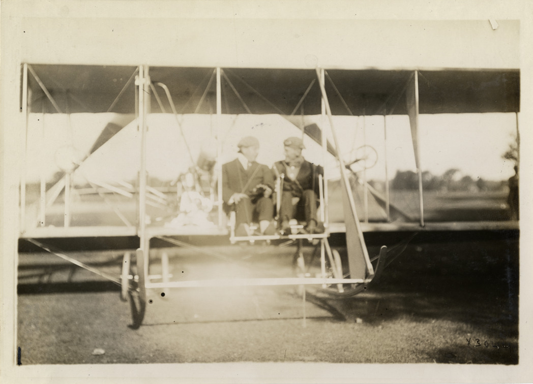 View of aviator and unidentified man seated in airplane at Grosse Pointe aviation meet. Stamped on back: "Spooner & Wells, Inc., photographers, 1231 Woodward Ave., Detroit, Mich., telephone North 1745." Handwritten on back: "Aircraft competitions--Grosse Pointe aviation meet, 1911." Label on file: "Regarding the Grosse Pointe file. The aviation event took place at the then Grosse Pointe Golf Club, now the site of the Grosse Pointe High School. The occasion was the result of Russell A. Alger's effort to bring the Wright airplane to Detroit. Alger was a founder of the Detroit Aviation Society and an investor in the Wright Airplane Co. The planes [sic] pilot, Frank R. Coffyn, took 41 high status passengers aloft during the period, June 18-20, 1911. Later Alger bought the plane and had Coffyn teach him to fly it."