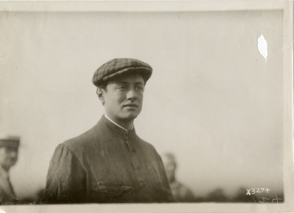 View of man at Detroit aviation meet. Handwritten on back: "Aircraft competitions--Detroit aviation meet, 1911." Label on file: "This event took place between June 29 and July 4, 1911. The competition was populated by the Moisant Aviators, a traveling aviation show, with prizes reported to be in the area of $25,000. Photos indicate that only two airplanes were in action, a Curtis and a Bleriot. The Bleriot crashed."