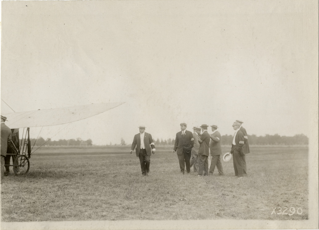 View of group of men standing in field at Detroit aviation meet; part of airplane visible on left. Handwritten on back: "Aircraft competitions--Detroit aviation meet, 1911." Label on file: "This event took place between June 29 and July 4, 1911. The competition was populated by the Moisant Aviators, a traveling aviation show, with prizes reported to be in the area of $25,000. Photos indicate that only two airplanes were in action, a Curtis and a Bleriot. The Bleriot crashed."
