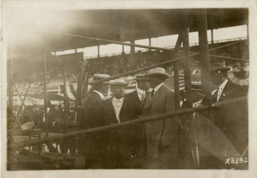 View of group of men in grandstand at Detroit aviation meet. Handwritten on back: "Aircraft competitions--Detroit aviation meet, 1911." Label on file: "This event took place between June 29 and July 4, 1911. The competition was populated by the Moisant Aviators, a traveling aviation show, with prizes reported to be in the area of $25,000. Photos indicate that only two airplanes were in action, a Curtis and a Bleriot. The Bleriot crashed."