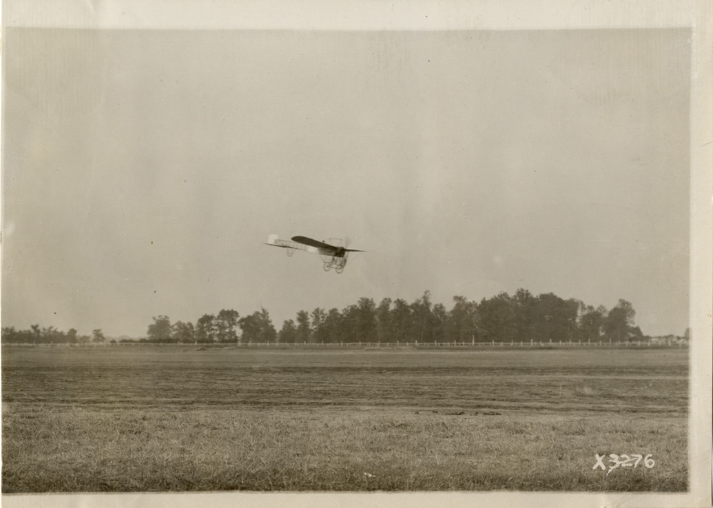 View of airplane about to land in field at Detroit aviation meet. Handwritten on back: "Aircraft competitions--Detroit aviation meet, 1911." Label on file: "This event took place between June 29 and July 4, 1911. The competition was populated by the Moisant Aviators, a traveling aviation show, with prizes reported to be in the area of $25,000. Photos indicate that only two airplanes were in action, a Curtis and a Bleriot. The Bleriot crashed."