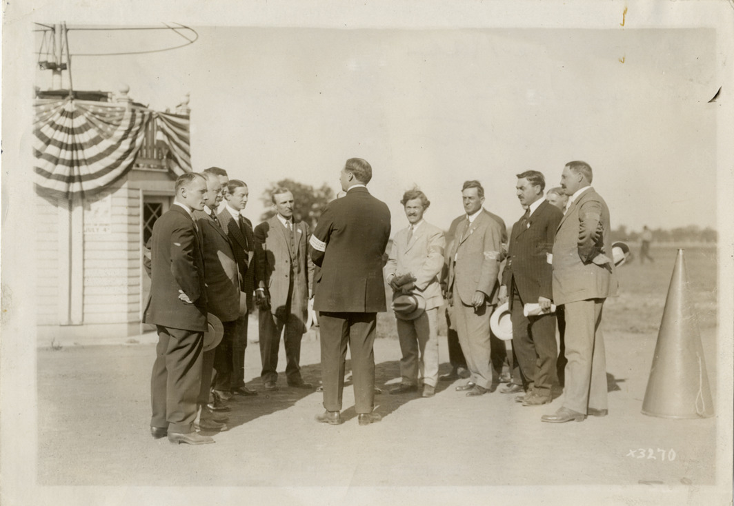 View of Mr. McRae, president of the Michigan Board of Commerce welcoming group of aviators at Detroit aviation meet. Stamped on back: "Spooner & Wells, Inc., photographers, 1231 Woodward Ave., Detroit, Mich., telephone North 1745." Handwritten on back: "Aircraft competitions--Detroit aviation meet, 1911. Pres. McRae of Mi. Board of Commerce welcomes the aviators." Label on file: "This event took place between June 29 and July 4, 1911. The competition was populated by the Moisant Aviators, a traveling aviation show, with prizes reported to be in the area of $25,000. Photos indicate that only two airplanes were in action, a Curtis and a Bleriot. The Bleriot crashed."