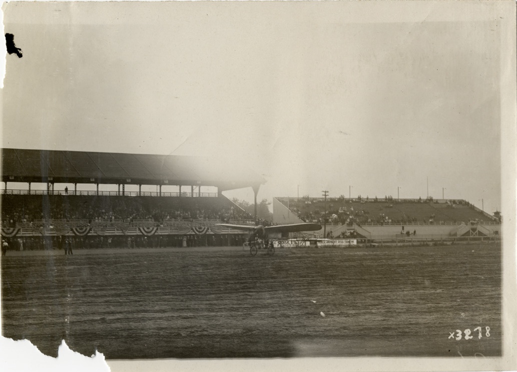 View of airplane in front of grandstand at Detroit aviation meet. Handwritten on back: "Aircraft competitions--Detroit aviation meet, 1911." Label on file: "This event took place between June 29 and July 4, 1911. The competition was populated by the Moisant Aviators, a traveling aviation show, with prizes reported to be in the area of $25,000. Photos indicate that only two airplanes were in action, a Curtis and a Bleriot. The Bleriot crashed."