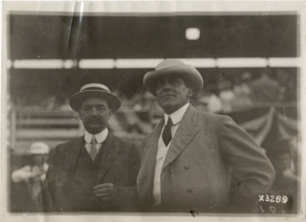 View of Mr. Moisant and Chase Salmon Osborn, governor of Michigan, in grandstand at Detroit aviation meet. Stamped on back: "Spooner & Wells, Inc., photographers, 1231 Woodward Ave., Detroit, Mich., telephone North 1745." Handwritten on back: "Aircraft competitions--Detroit aviation meet, 1911. Mr. Moisant, Mich. gov. Osborne [sic]." Label on file: "This event took place between June 29 and July 4, 1911. The competition was populated by the Moisant Aviators, a traveling aviation show, with prizes reported to be in the area of $25,000. Photos indicate that only two airplanes were in action, a Curtis and a Bleriot. The Bleriot crashed."