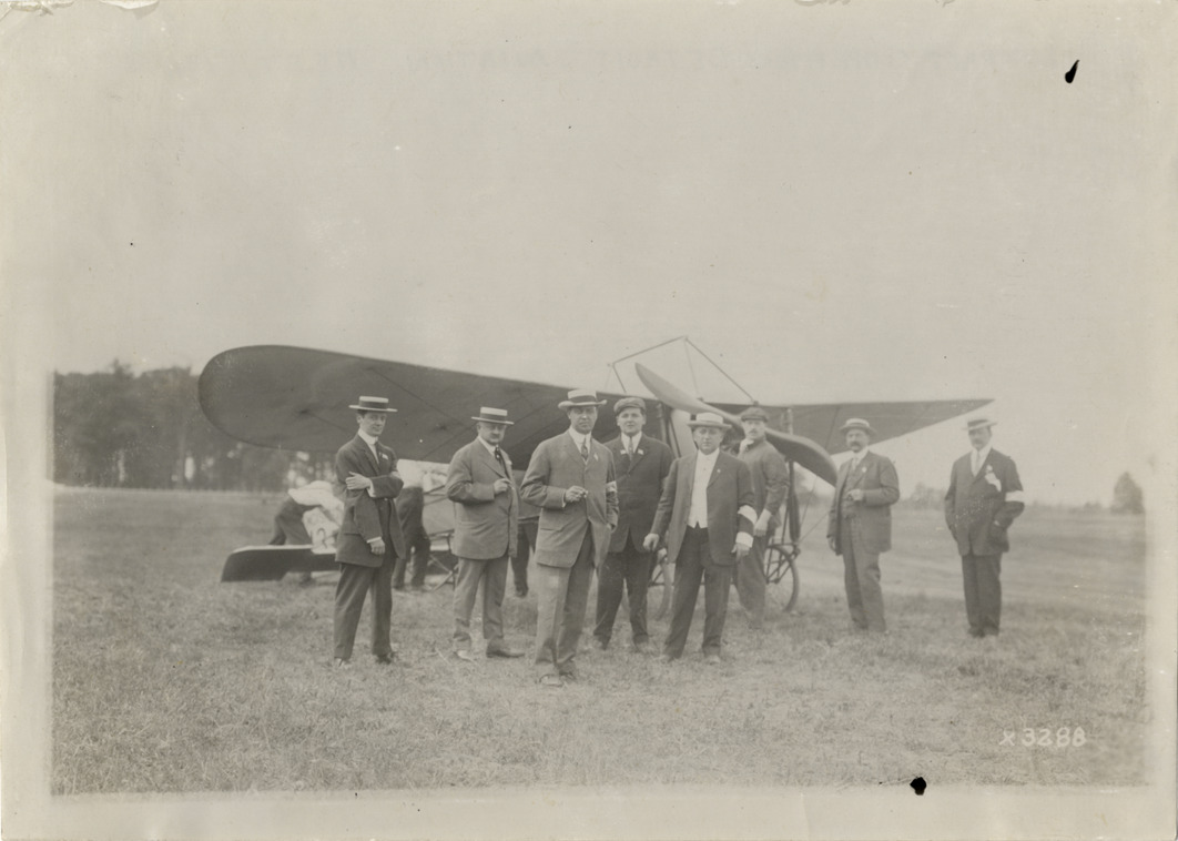 Men standing in front of airplane at Detroit aviation meet