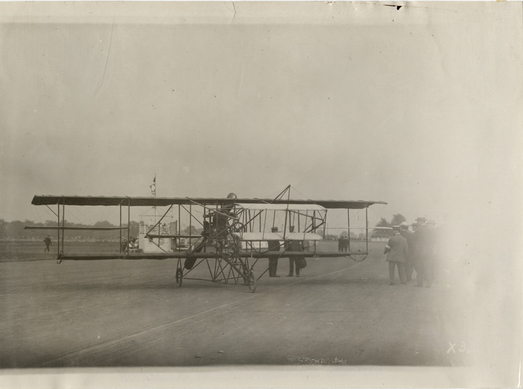 View of airplane on track at Detroit aviation meet; several men stand nearby. Handwritten on back: "Aircraft competitions--Detroit aviation meet, 1911." Label on file: "This event took place between June 29 and July 4, 1911. The competition was populated by the Moisant Aviators, a traveling aviation show, with prizes reported to be in the area of $25,000. Photos indicate that only two airplanes were in action, a Curtis and a Bleriot. The Bleriot crashed."
