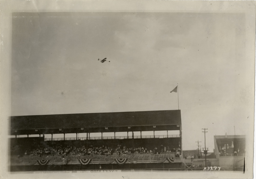 View of airplane flying over grandstand at Detroit aviation meet. Handwritten on back: "Aircraft competitions--Detroit aviation meet, 1911." Label on file: "This event took place between June 29 and July 4, 1911. The competition was populated by the Moisant Aviators, a traveling aviation show, with prizes reported to be in the area of $25,000. Photos indicate that only two airplanes were in action, a Curtis and a Bleriot. The Bleriot crashed."