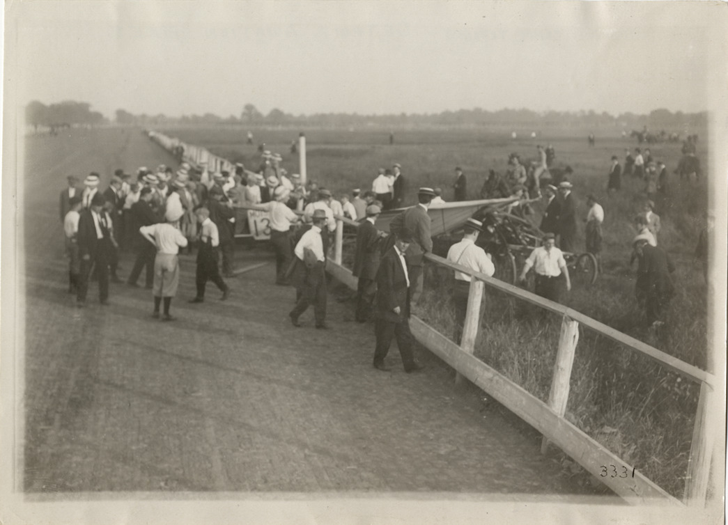 View of crowd surrounding damaged airplane near fence at Detroit aviation meet. Stamped on back: "Spooner & Wells, Inc., photographers, 1231 Woodward Ave., Detroit, Mich., telephone North 1745." Handwritten on back: "Aircraft competitions--Detroit aviation meet, 1911." Label on file: "This event took place between June 29 and July 4, 1911. The competition was populated by the Moisant Aviators, a traveling aviation show, with prizes reported to be in the area of $25,000. Photos indicate that only two airplanes were in action, a Curtis and a Bleriot. The Bleriot crashed."
