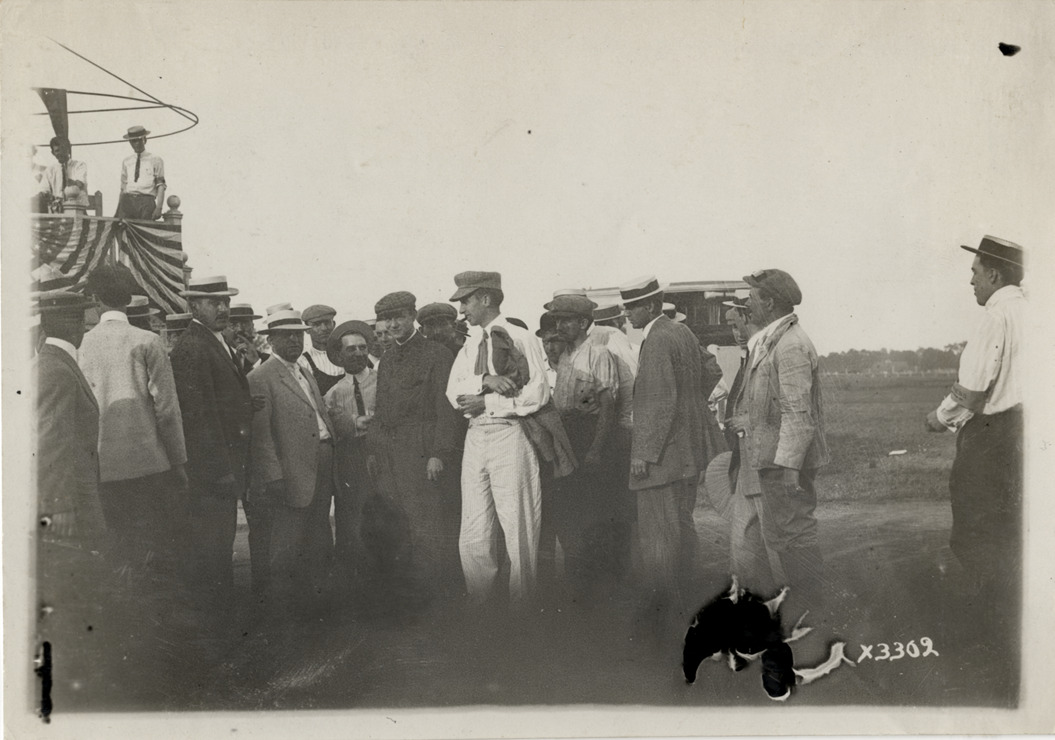 View of group of men at Detroit aviation meet. Reviewing stand draped with bunting in background. Handwritten on back: "Aircraft competitions--Detroit aviation meet, 1911." Label on file: "This event took place between June 29 and July 4, 1911. The competition was populated by the Moisant Aviators, a traveling aviation show, with prizes reported to be in the area of $25,000. Photos indicate that only two airplanes were in action, a Curtis and a Bleriot. The Bleriot crashed."