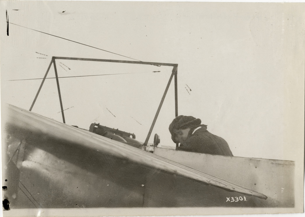 View of aviator in airplane at Detroit aviation meet. Handwritten on back: "Aircraft competitions--Detroit aviation meet, 1911." Label on file: "This event took place between June 29 and July 4, 1911. The competition was populated by the Moisant Aviators, a traveling aviation show, with prizes reported to be in the area of $25,000. Photos indicate that only two airplanes were in action, a Curtis and a Bleriot. The Bleriot crashed."