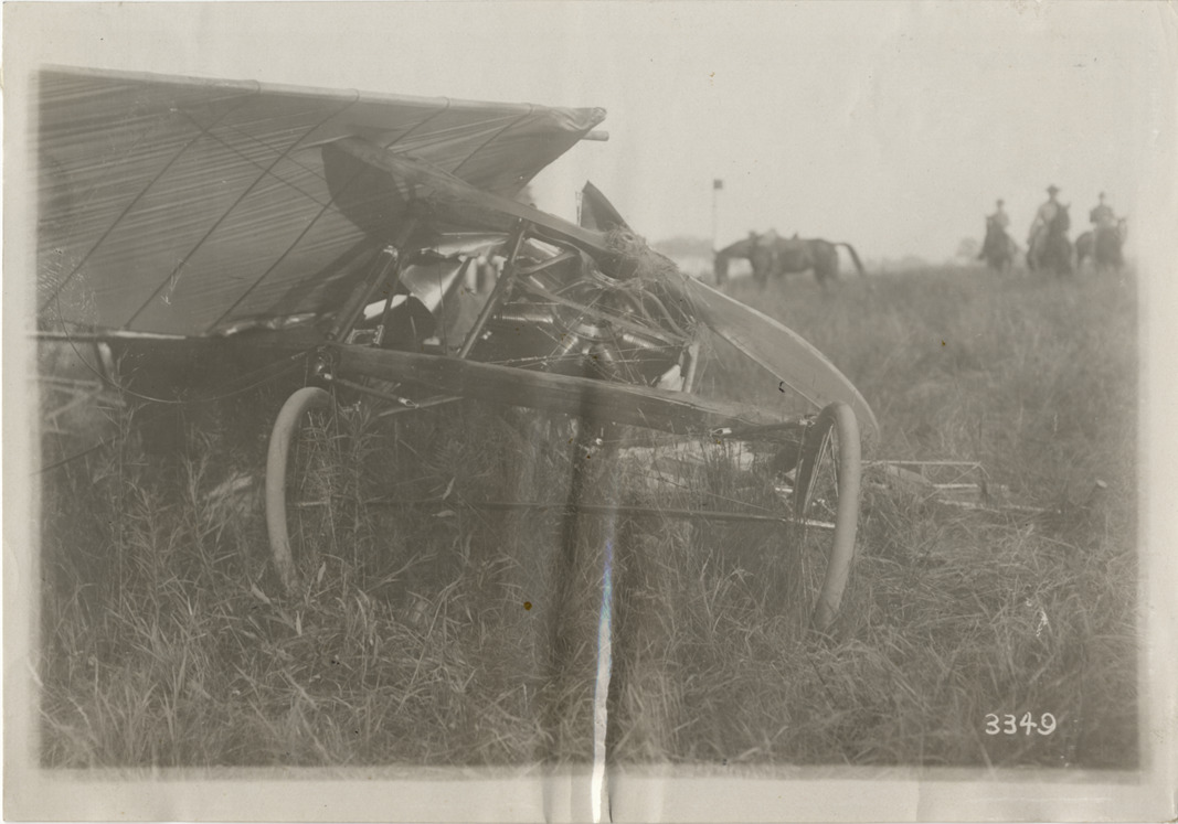 View of damaged airplane at Detroit aviation meet; onlookers stand around wreckage. Stamped on back: "Spooner & Wells, Inc., photographers, 1231 Woodward Ave., Detroit, Mich., telephone North 1745." Handwritten on back: "Aircraft competitions--Detroit aviation meet, 1911." Label on file: "This event took place between June 29 and July 4, 1911. The competition was populated by the Moisant Aviators, a traveling aviation show, with prizes reported to be in the area of $25,000. Photos indicate that only two airplanes were in action, a Curtis and a Bleriot. The Bleriot crashed."