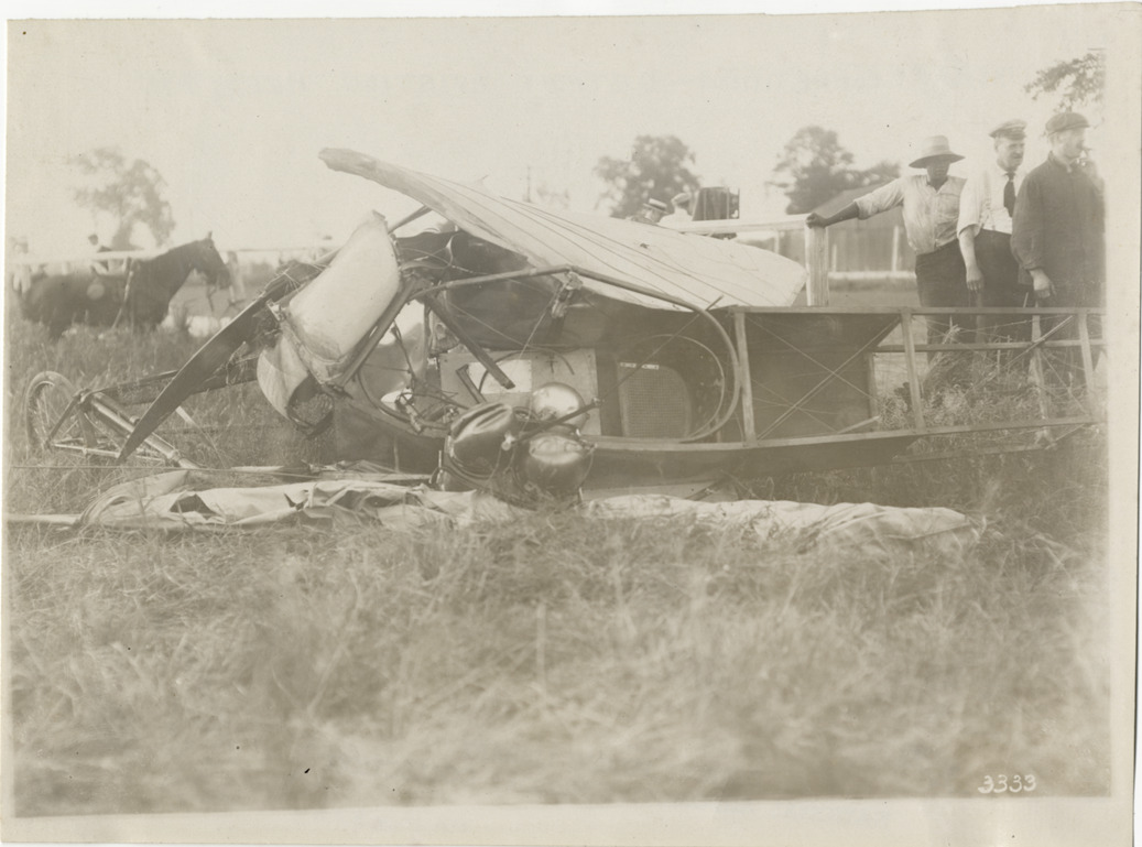View of damaged airplane at Detroit aviation meet; onlookers stand around wreckage. Handwritten on back: "Aircraft competitions--Detroit aviation meet, 1911." Label on file: "This event took place between June 29 and July 4, 1911. The competition was populated by the Moisant Aviators, a traveling aviation show, with prizes reported to be in the area of $25,000. Photos indicate that only two airplanes were in action, a Curtis and a Bleriot. The Bleriot crashed."