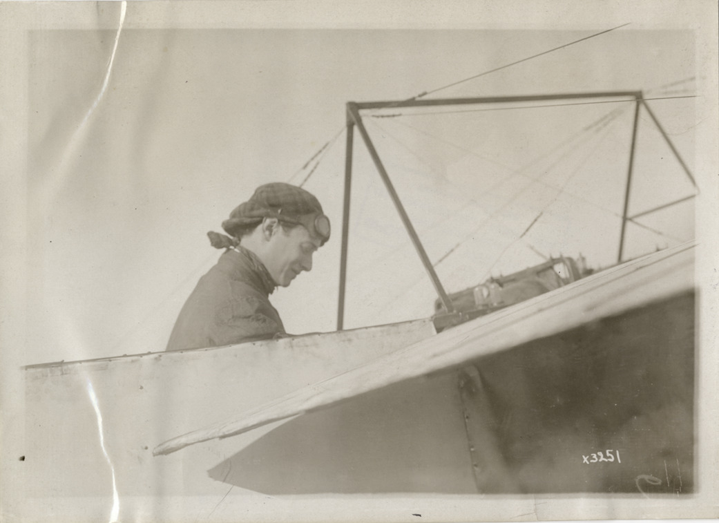 View of aviator seated in airplane at Detroit aviation meet. Stamped on back: "Spooner & Wells, Inc., photographers, 1231 Woodward Ave., Detroit, Mich., telephone North 1745." Handwritten on back: "Aircraft competitions--Detroit aviation meet, 1911." Label on file: "This event took place between June 29 and July 4, 1911. The competition was populated by the Moisant Aviators, a traveling aviation show, with prizes reported to be in the area of $25,000. Photos indicate that only two airplanes were in action, a Curtis and a Bleriot. The Bleriot crashed."