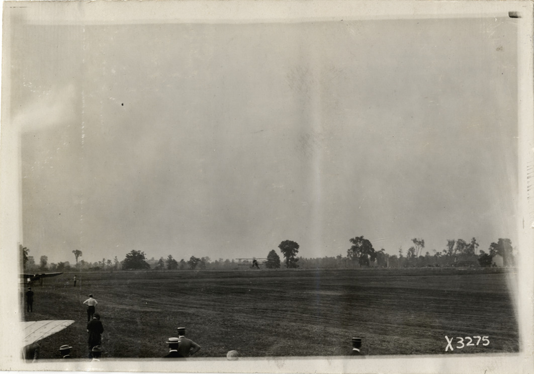 View of airplane landing in field at Detroit aviation meet. Stamped on back: "Spooner & Wells, Inc., photographers, 1231 Woodward Ave., Detroit, Mich., telephone North 1745." Handwritten on back: "Aircraft competitions--Detroit aviation meet, 1911." Label on file: "This event took place between June 29 and July 4, 1911. The competition was populated by the Moisant Aviators, a traveling aviation show, with prizes reported to be in the area of $25,000. Photos indicate that only two airplanes were in action, a Curtis and a Bleriot. The Bleriot crashed."