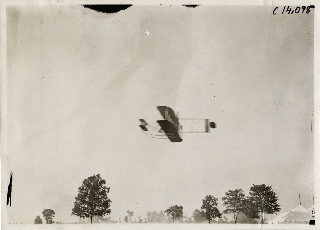 View of airplane in flight at aviation exhibition, Michigan State Fairgrounds. Handwritten on back: "Airplane racing--Michigan State Fairgrounds, Detroit, Mi., 1910." Label on file: "Aviation racing, 1910. The first showing of an airplane in Detroit took place July 14, 1910. It was not a race it was simply a demonstration by Arch Hoxey [sic] in what appears to be an early model Wright airplane at the Detroit Fair Grounds."