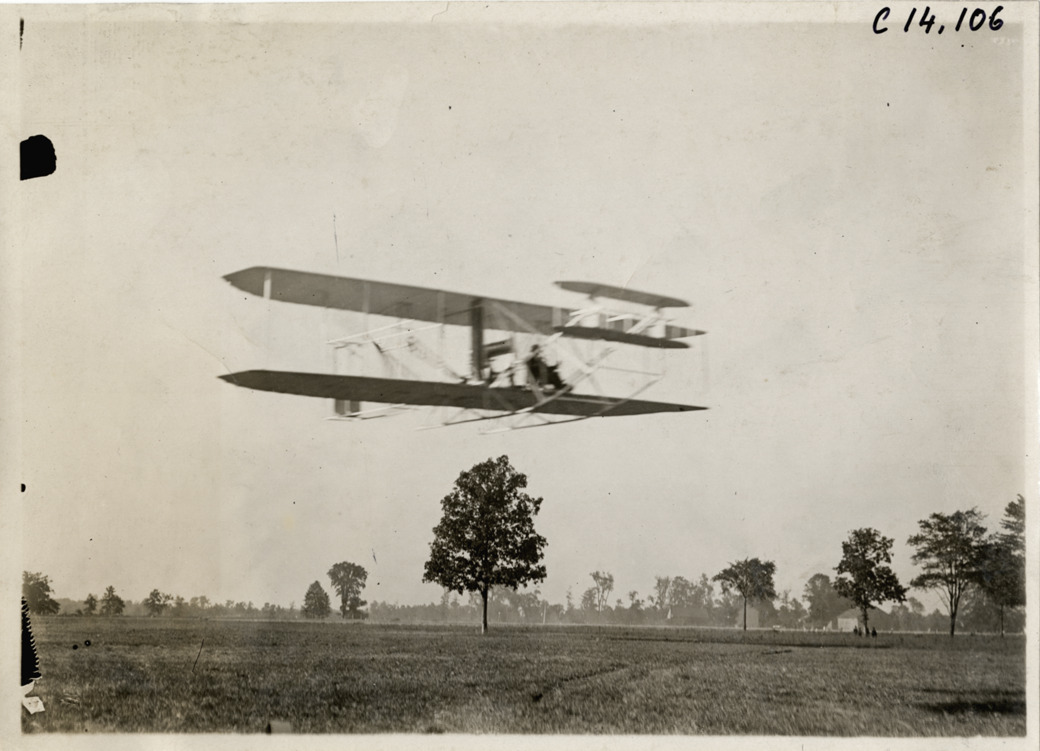 View of airplane in flight over field at aviation exhibition, Michigan State Fairgrounds. Handwritten on back: "Airplane racing--Michigan State Fairgrounds, Detroit, Mi., 1910." Label on file: "Aviation racing, 1910. The first showing of an airplane in Detroit took place July 14, 1910. It was not a race it was simply a demonstration by Arch Hoxey [sic] in what appears to be an early model Wright airplane at the Detroit Fair Grounds."