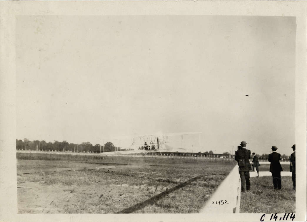 View of spectators watching airplane at aviation exhibition, Michigan State Fairgrounds. Stamped on back: "Spooner & Wells, Inc., photographers, telephone North 1745. 1231 Woodward Ave., Detroit, Mich. Detroit, 1231 Woodward, New York, 1931 Broadway." Handwritten on back: "Airplane racing--Michigan State Fairgrounds, Detroit, Mi., 1910. Archie Hoxsey." Label on file: "Aviation racing, 1910. The first showing of an airplane in Detroit took place July 14, 1910. It was not a race it was simply a demonstration by Arch Hoxey [sic] in what appears to be an early model Wright airplane at the Detroit Fair Grounds."