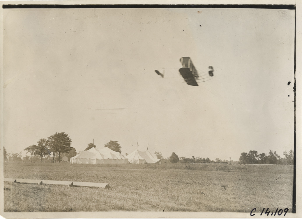 View of airplane in flight over field at aviation exhibition, Michigan State Fairgrounds. Tents in background. Handwritten on back: "Airplane racing--Michigan State Fairgrounds, Detroit, Mi., 1910." Label on file: "Aviation racing, 1910. The first showing of an airplane in Detroit took place July 14, 1910. It was not a race it was simply a demonstration by Arch Hoxey [sic] in what appears to be an early model Wright airplane at the Detroit Fair Grounds."