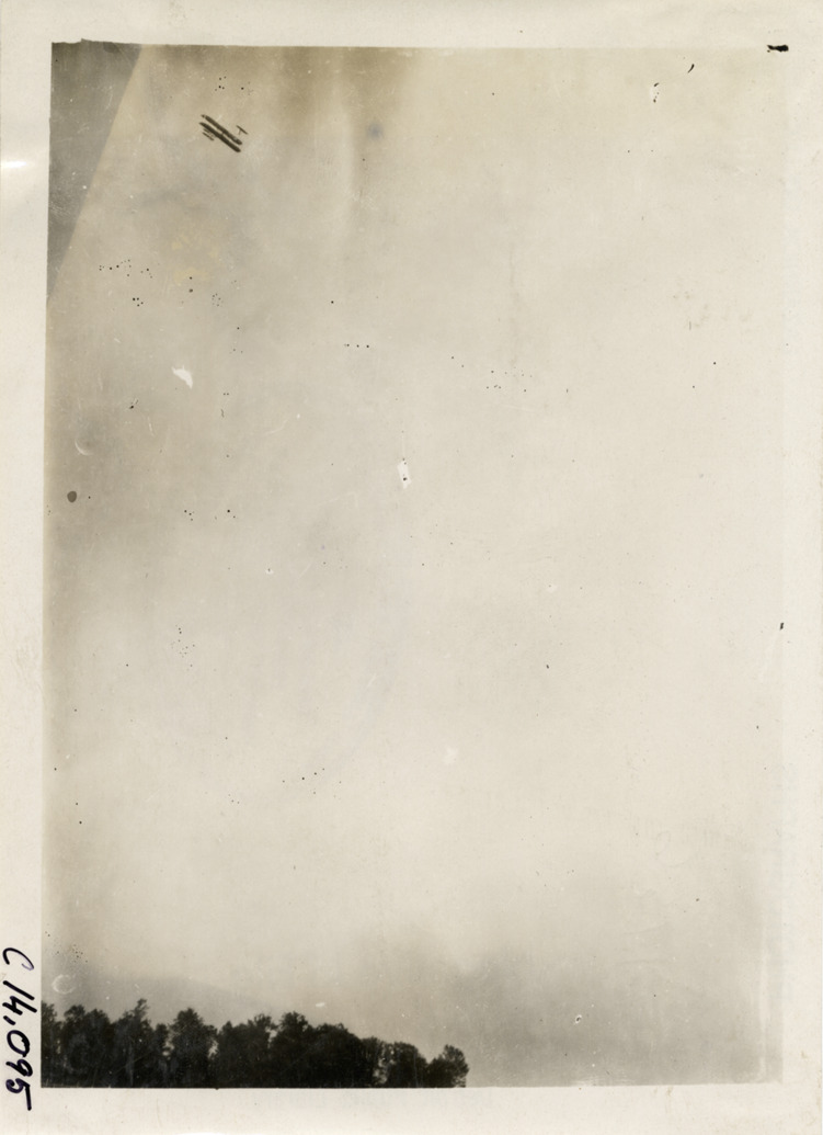 View of airplane in flight at aviation exhibition, Michigan State Fairgrounds. Stamped on back: "Spooner & Wells, Inc., photographers, telephone North 1745. 1231 Woodward Ave., Detroit, Mich. Detroit, 1231 Woodward, New York, 1931 Broadway." Handwritten on back: "Airplane racing--Michigan State Fairgrounds, Detroit, Mi., 1910." Label on file: "Aviation racing, 1910. The first showing of an airplane in Detroit took place July 14, 1910. It was not a race it was simply a demonstration by Arch Hoxey [sic] in what appears to be an early model Wright airplane at the Detroit Fair Grounds."