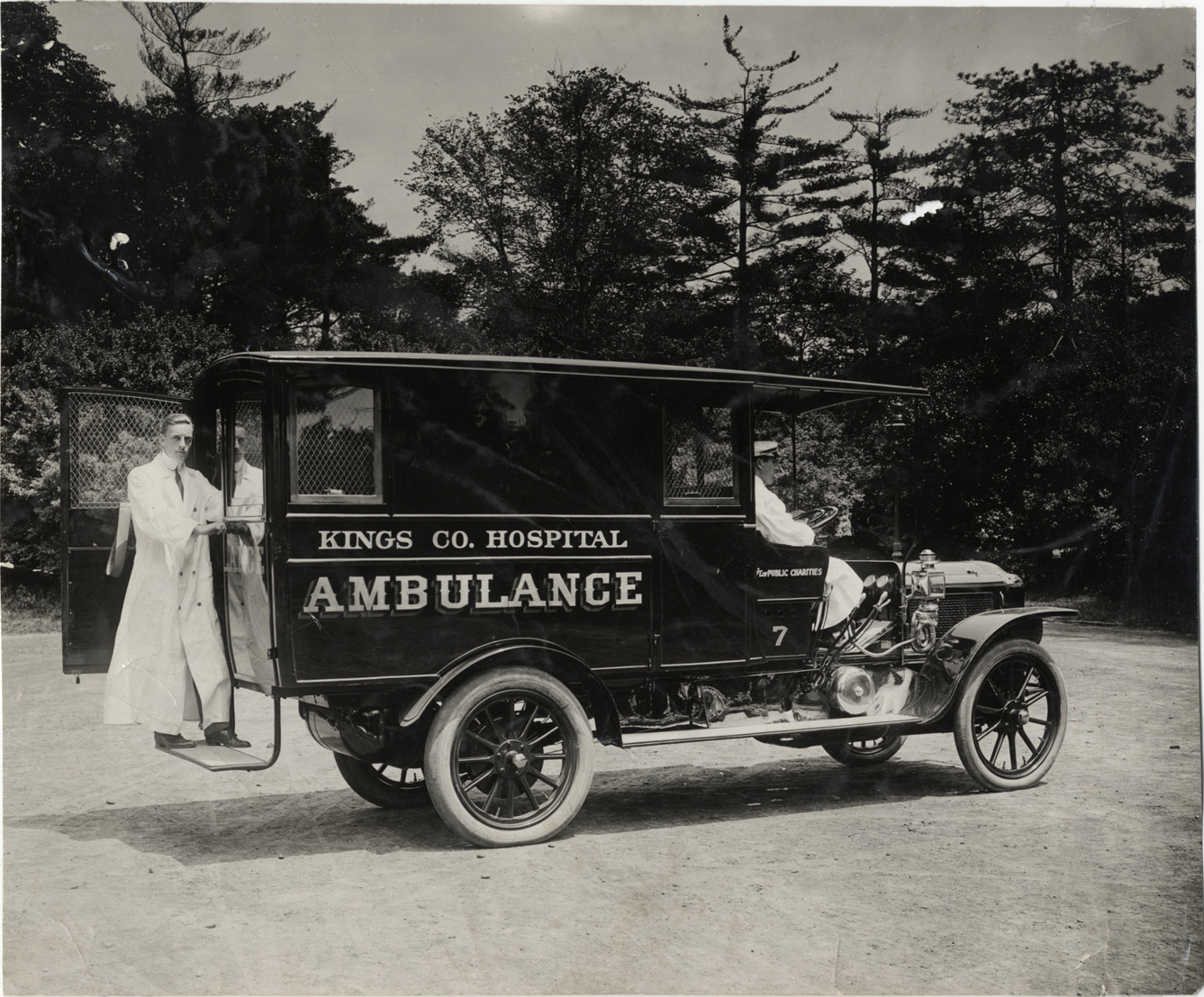 Side view of driver in 1908 White ambulance; man wearing white coat stands on rear running board of ambulance. Painted on side of vehicle: "Kings Co. Hospital ambulance. Dep't of Public Charities, 7." Stamped on back: "Spooner and Wells, 1931 Broadway, New York, duplicates any time, enlargements all sizes, tel. 3472-3473 Col., credit appreciated." Handwritten on back: "Ambulances--White, 1908."
