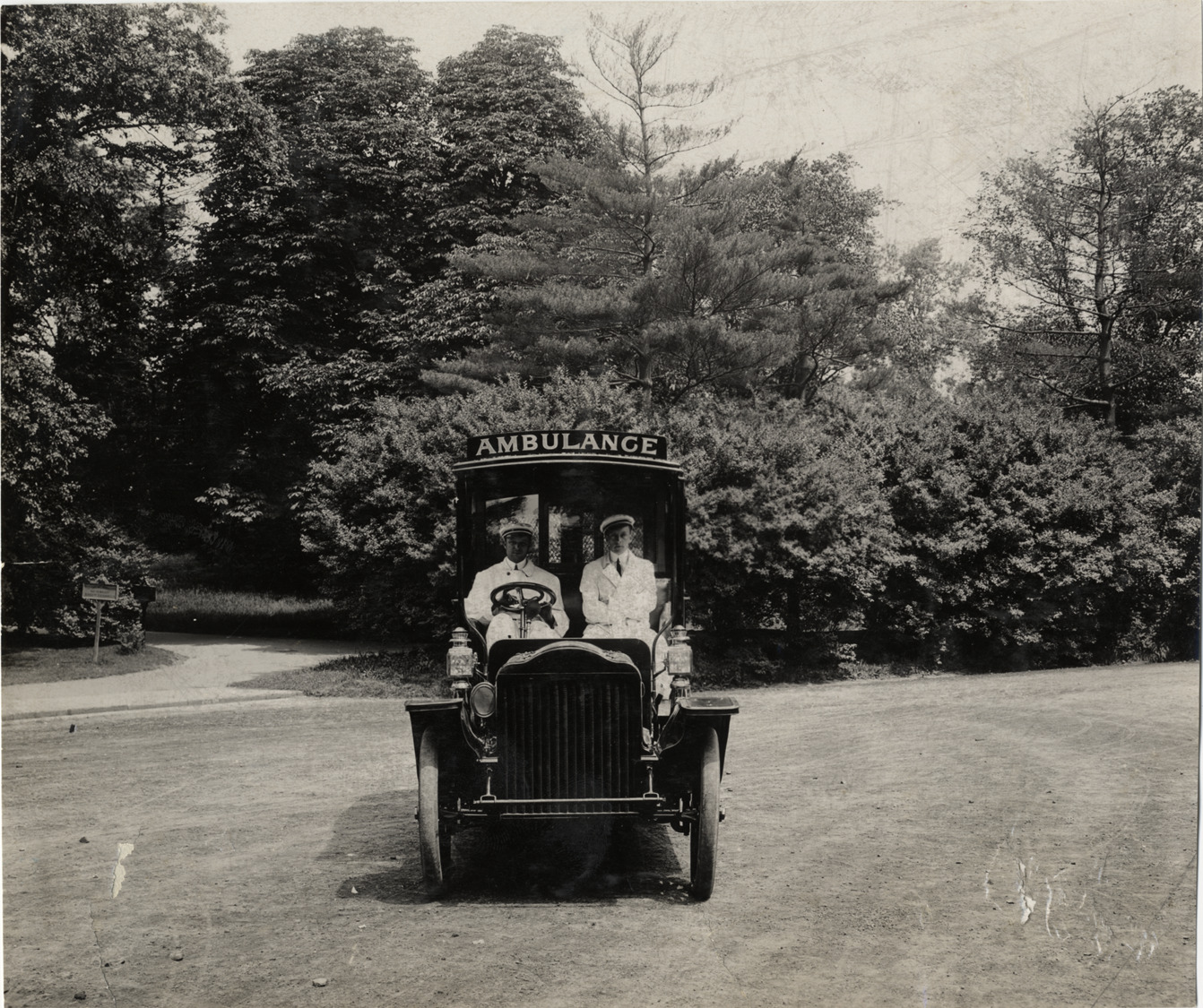 Favorite this☆ 1908 White ambulance Description: Front view of driver and man wearing white coat in 1908 White ambulance. Sign on vehicle: "Ambulance." Handwritten on back: "Ambulances--White, 1908." Details Resource ID: na003250 Subject: Ambulances Ambulance drivers Kings County Hospital (Kings County, N.Y.)--Employees White Company (Cleveland, Ohio) Photographic prints Date Issued: Unknown year Format: 1 photographic print ; 7.5 x 9 in. Member of: National Automotive History Collection Lazarnick Collection Filing Location: Ambulances--White, 1908 Rights: Physical rights are retained by DPL. Copyright is retained in accordance with U.S. copyright laws.