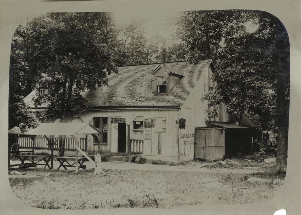 View of Bluff Grove House; one-story side-gabled wooden frame house. Picnic tables under shelter in foreground. Sign on building: "Bluff Grove House, F.C. Albig, prop." Stamped on back: "Photo by F. Ed. Spooner, 1536 B'way, telephone 6536-38th St., New York, N.Y." Handwritten on back: "Architecture--Commercial."