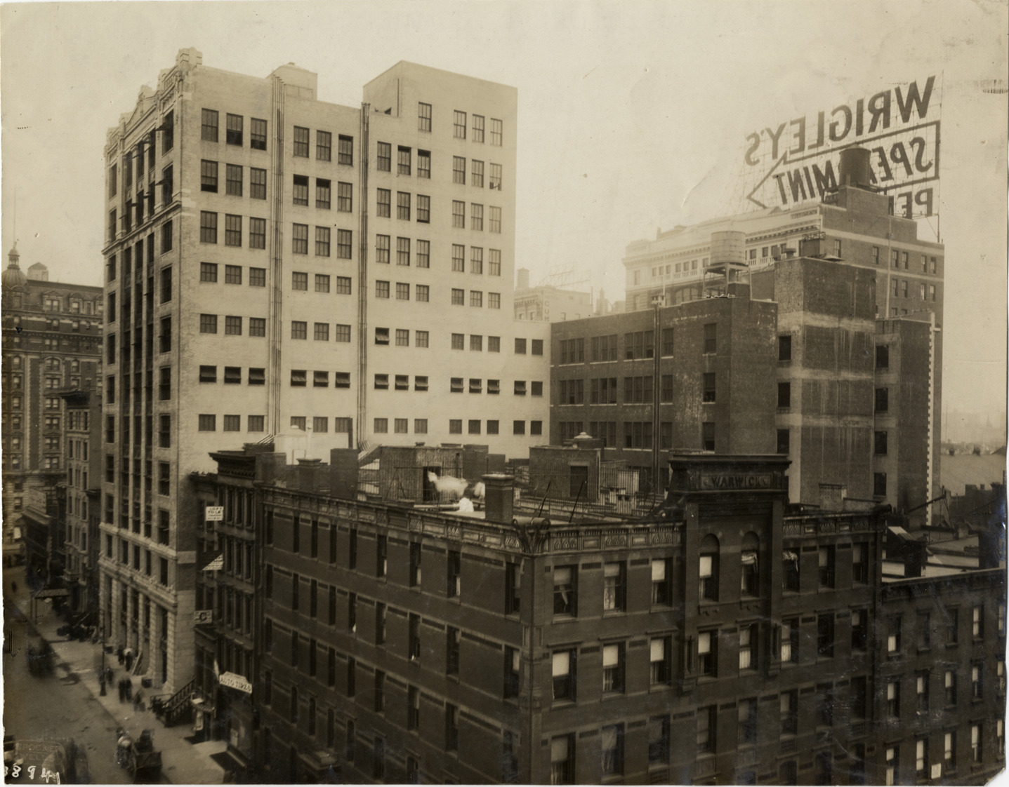 View of commercial and office buildings. Inscription on building in foreground: "Warwick." Stamped on back: "Spooner & Wells, Inc., photographers, telephones 3472-3473 Columbus, 1931 Broadway, New York." Handwritten on back: "Architecture--Commercial, 1911."