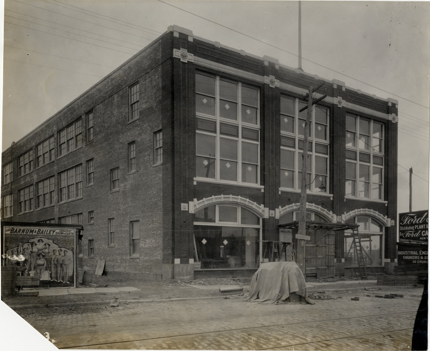 View of commercial building under construction. Three-story brick building has arched windows on ground level. Billboard for Barnum & Bailey circus on left; partial view of Ford sign on right. Stamped on back: "Spooner & Wells, Inc., photographers, telephones 3472-3473 Columbus, 1931 Broadway, New York." Handwritten on back: "Architecture--Commercial."