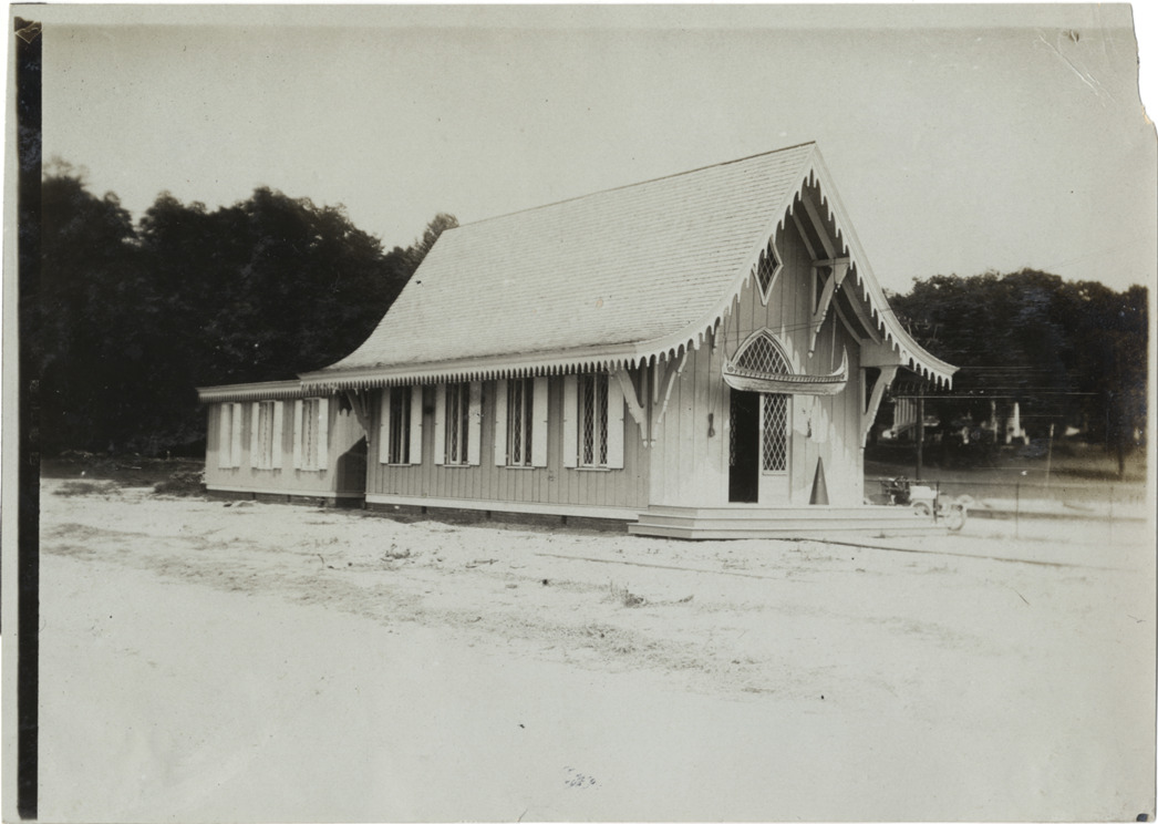View of Swiss Chalet style one-story, front-gabled wooden-frame building with decorative vergeboards and mullioned windows. Canoe is suspended over entrance. Handwritten on back: "Architecture--Commercial. N.J.Y.C."