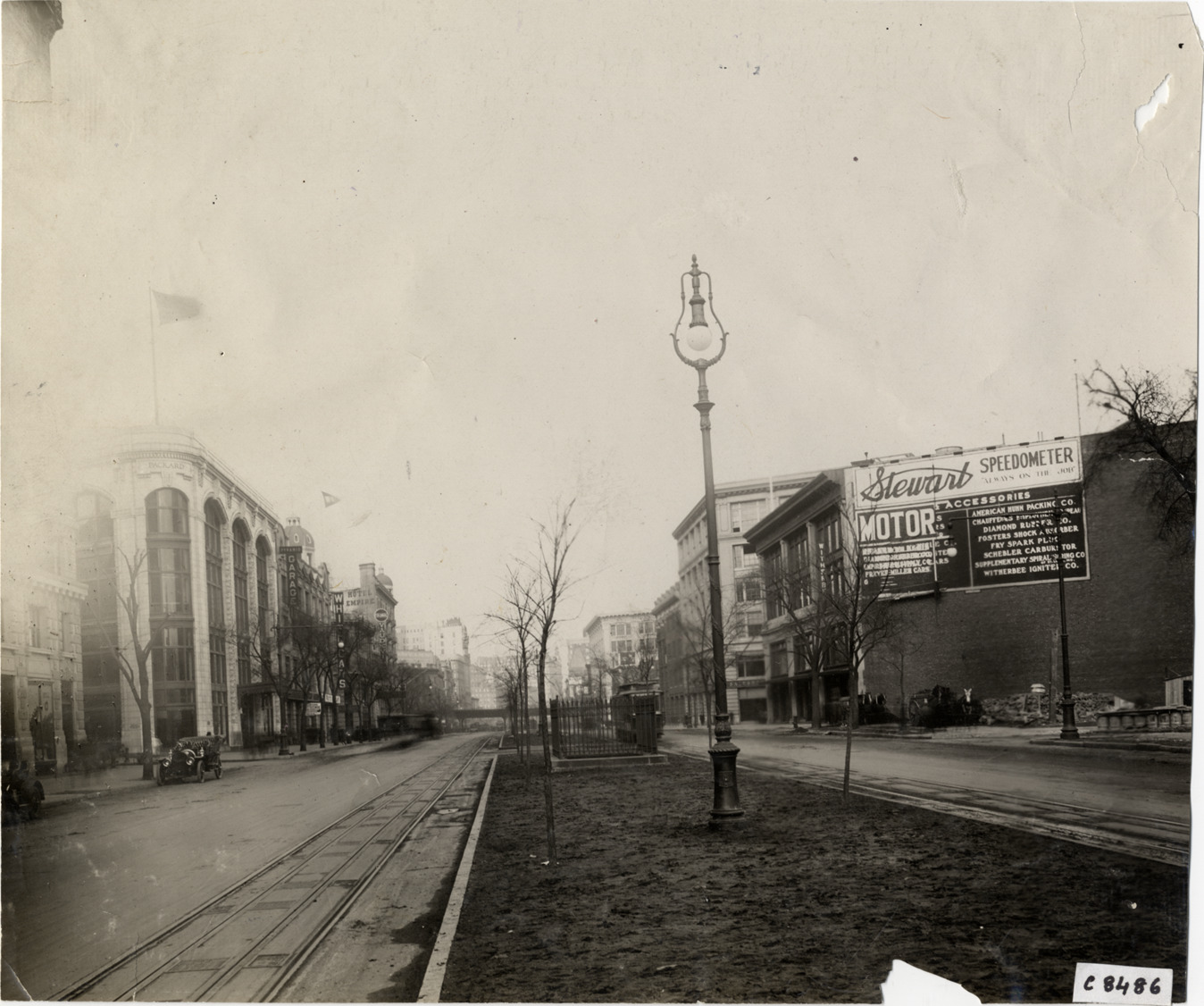 View of several commercial buildings on boulevard. Packard building in foreground; signs for White cars, Pyramid garage and Hotel Empire are visible. Billboard for Stewart speedometers on building in foreground. Handwritten on back: "Architecture--Commercial, 1908."