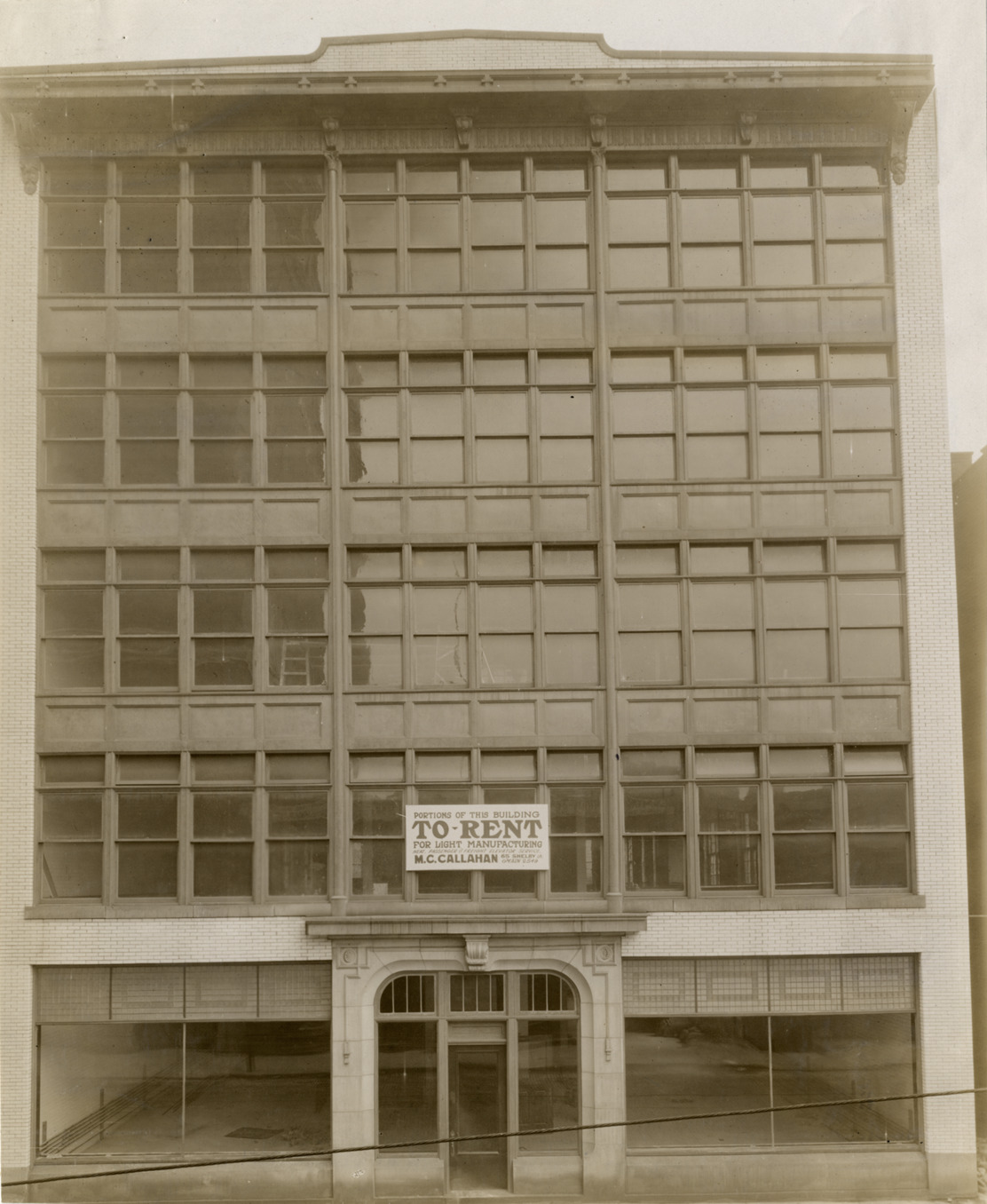 View of empty commercial building located on West Congress Street in Detroit, Michigan. Sign on building: "Portions of this building to rent for light manufacturing, heat, passenger & freight elevator service, M.C. Callahan, 65 Shelby St., Main 2549." Handwritten on back: "Architecture, Domestic, 1911. Building on West Congress Street, Detroit, Michigan."