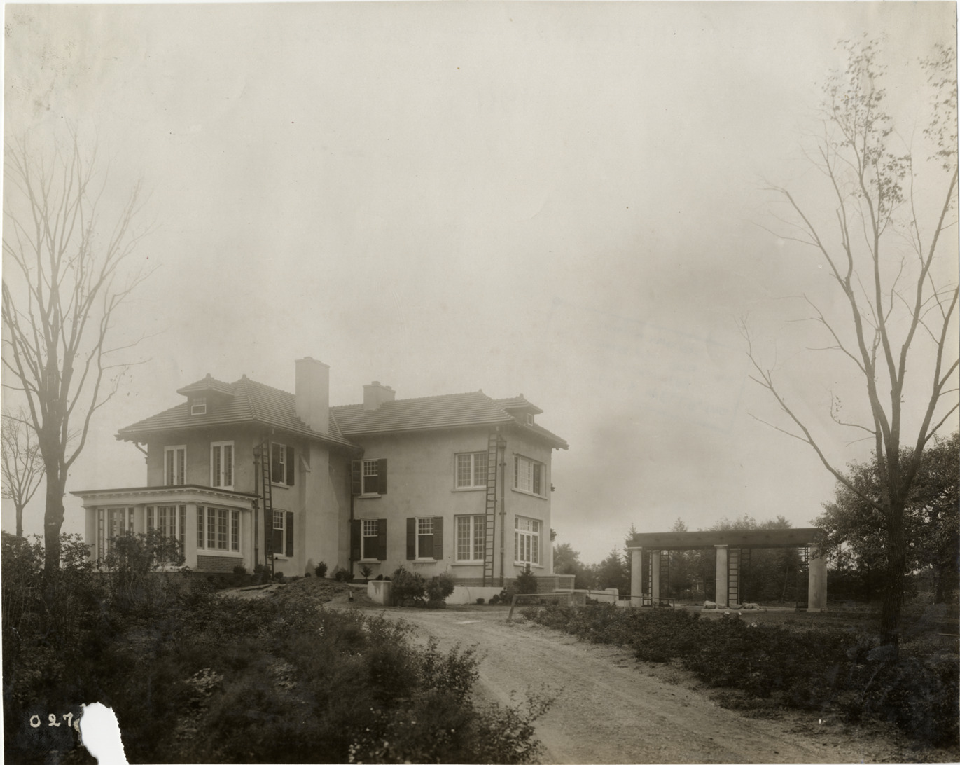 Side view of two-story house with stucco wall cladding, tile roof and roof dormers. Arbor in backyard. Stamped on back: "Spooner & Wells, Inc., photographers, 1231 Woodward Ave., Detroit, Mich., telephone North 1745." Handwritten on back: "Architecture--Domestic, 1911."